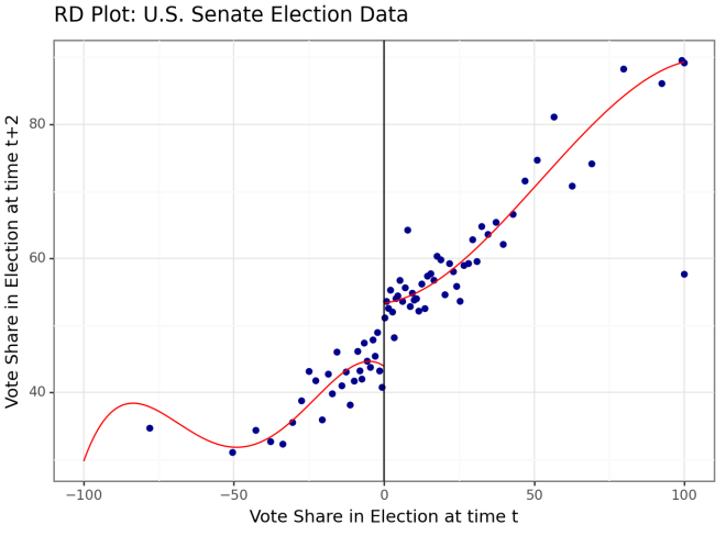 I praksis estimeres to separate regresjonskurver, én for populasjonen med verdi på cutoff-variabelen som er lavere enn cutoff-punktet, og en annen for gruppen som har verdi høyere enn cutoff-grensen. Estimatene som rapporteres i hovedtabellen etter kjøring av kommando svarer til den vertikale avstanden mellom de to regresjonskurvene målt ved cutoff-punktet.