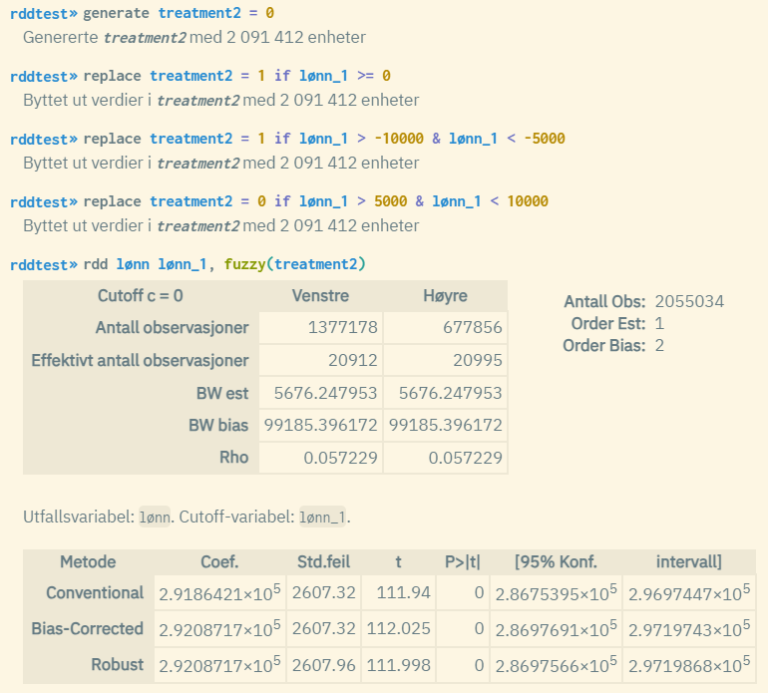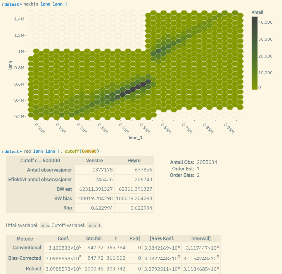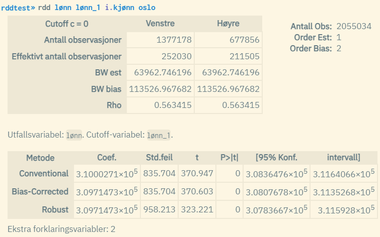 I eksempelet over brukes cutoff-grenseverdien 600000 ettersom vi vet at det er ved dette punktet at man kan observere en forskyvning av regresjonslinjene. Om man ønsker, kan man standardisere verdiene til cutoff-variabelen «lønn_1» ved å trekke 600 000 fra alle verdier. Da vil cutoff-grenseverdien bli 0 i stedet, og man trenger ikke bruke opsjonen cutoff() siden 0 er standardvalget for rdd. Resultatene av rdd-kjøringen vil bli identiske.