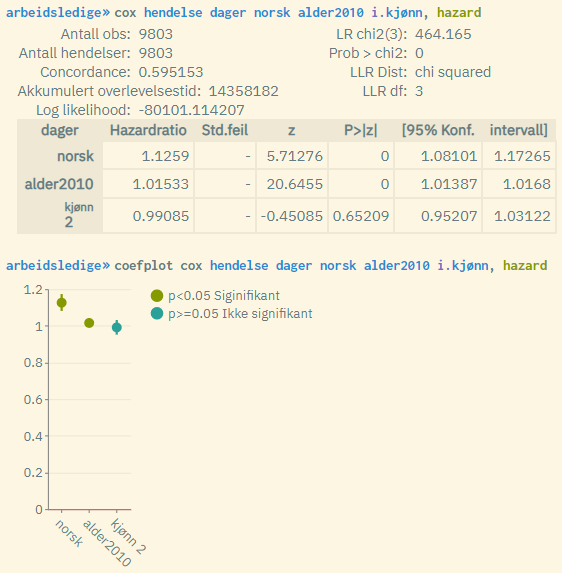 Nederste eksempel viser estimerte hazardrater i stedet for koeffisienter. Disse viser den ratevise endringen i risiko ved en enhets økning i den aktuelle variabelen, og skal tolkes på en annen måte. Nullpunktet som antyder ingen sammenheng er her verdien 1. Verdier over 1 betyr positiv effekt på risiko (implisitt negativ effekt på overlevelsestid), og vice versa for verdier under 1.