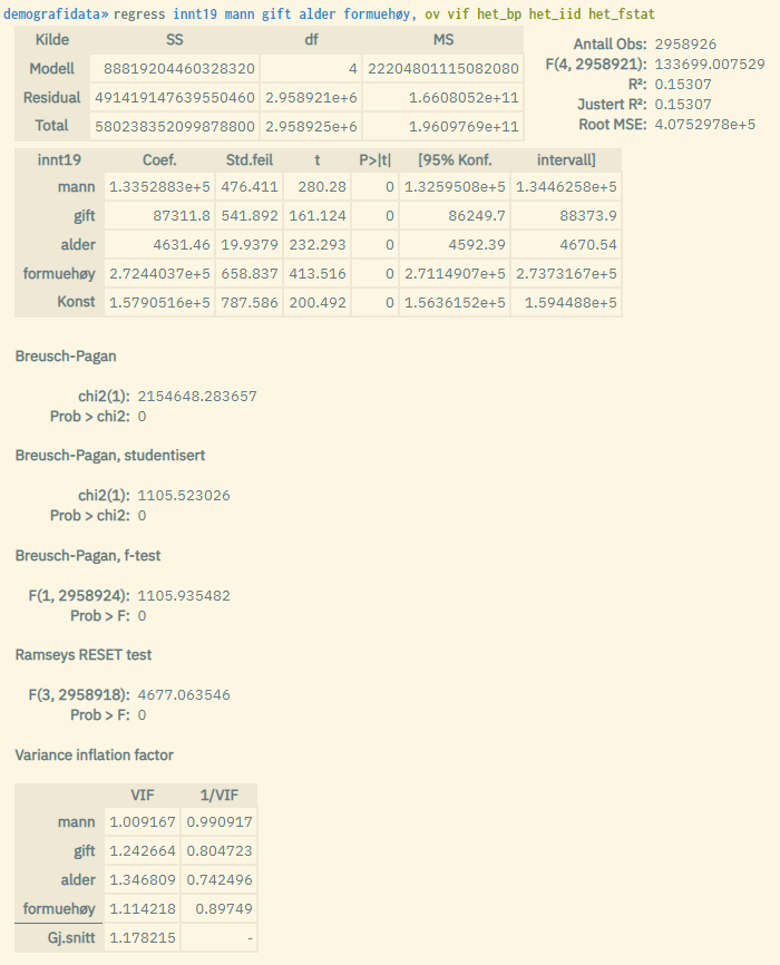 Eksempel der en tester for utelatte variabler, multikollinearitet og heteroskedastisitet: