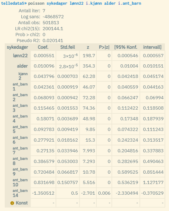 • irr: Rapporterer incidence rate ratio-verdier i stedet for koeffisientverdier (verdiene transformeres gjennom den naturlige eksponensialfunksjonen). Verdien 1 betyr ingen effekt. Verdier over 1 betyr positiv effekt, mens verdier under 1 betyr negativ effekt.