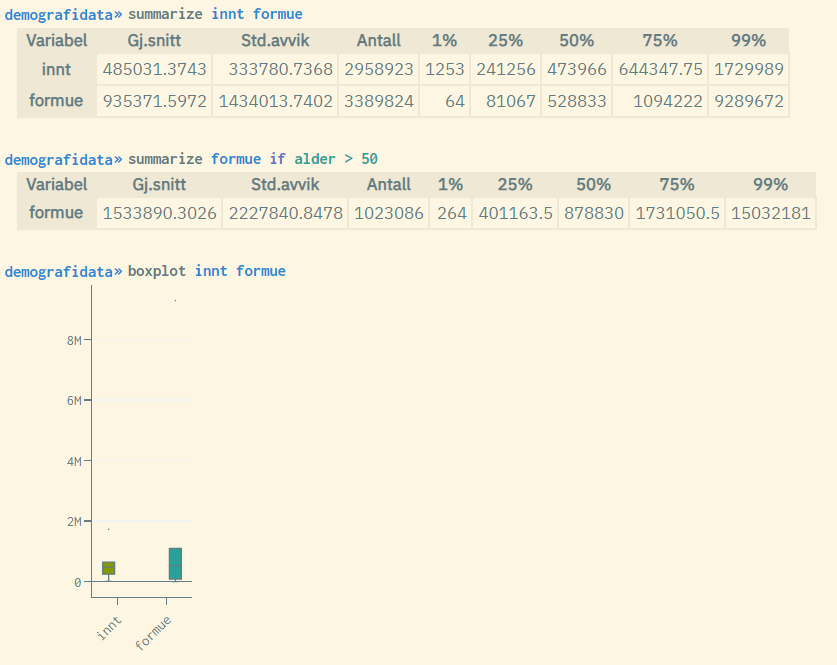 Kommandoene summarize og boxplot brukes til å vise oppsummerende