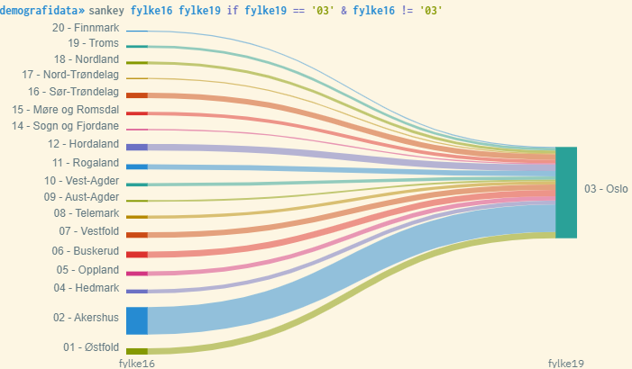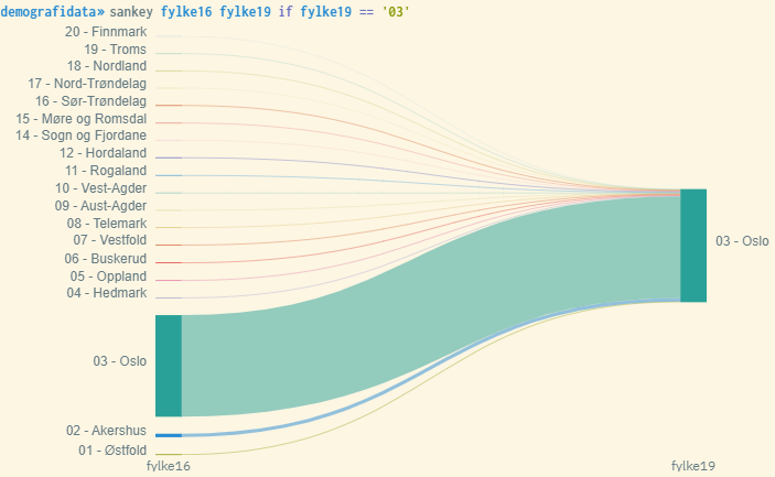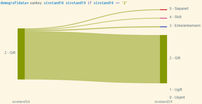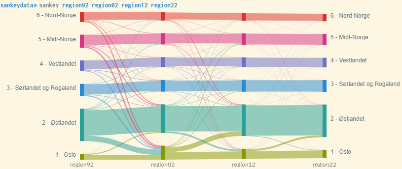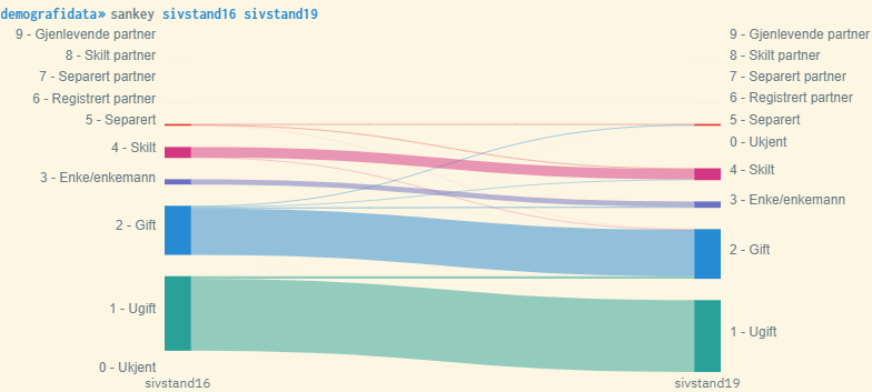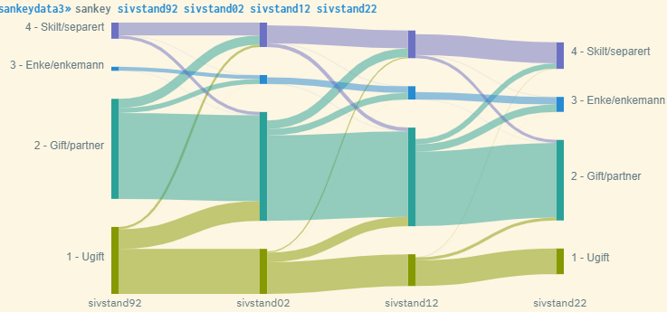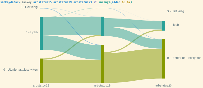 Sankey-diagram er en måte å visualisere overganger mellom statuser. I microdata.no kan dette brukes til å få oversikt over enheters (individers) bevegelser mellom to eller flere tidspunkter, enten for samme variabel eller for ulike variabler. En kan se på bevegelser mellom ulike typer tilstander (f.eks. arbeidssøkerstatus jobbstatus), eller endringer i fordelinger for samme variabel over tid (f.eks. bosted16 bosted19 eller sivilstand16 sivilstand19).