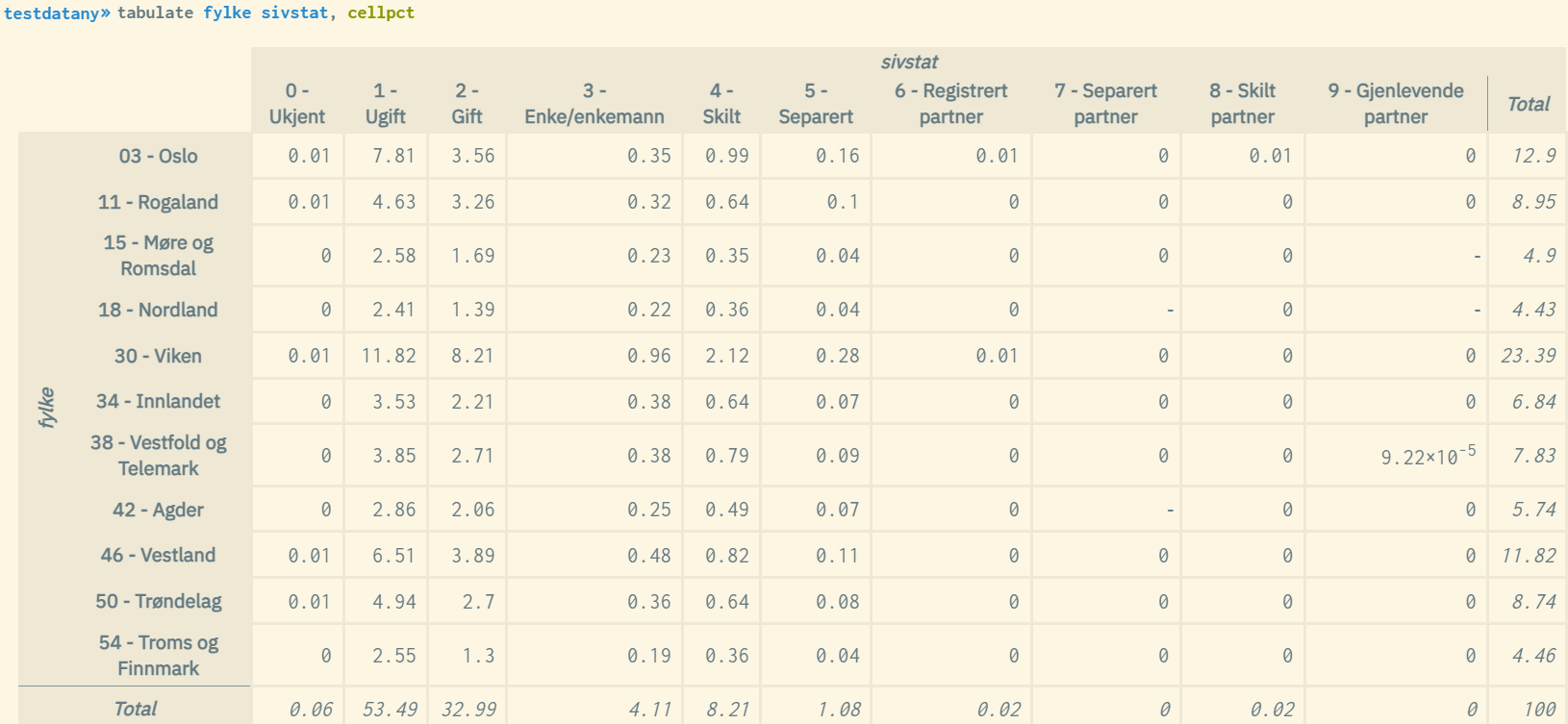 Kommandoen tabulate kan, i tillegg til å vise frekvenser (antall enheter) for kombinasjoner av verdier for de aktuelle variabler, brukes til å vise prosentandeler. Dette styres gjennom opsjoner: