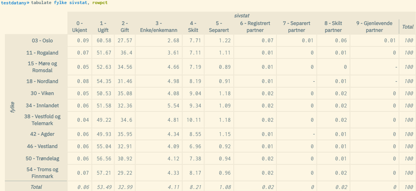 rowpct: rekkeprosent (andel av rekketotalen) -