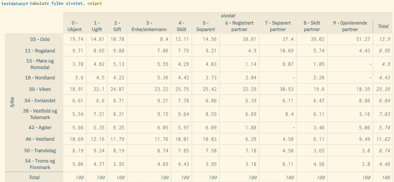 colpct: kolonneprosent (andel av kolonnetotalen) -