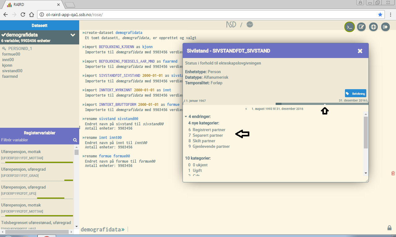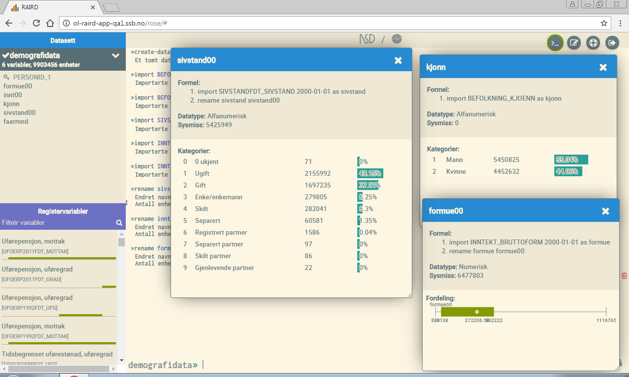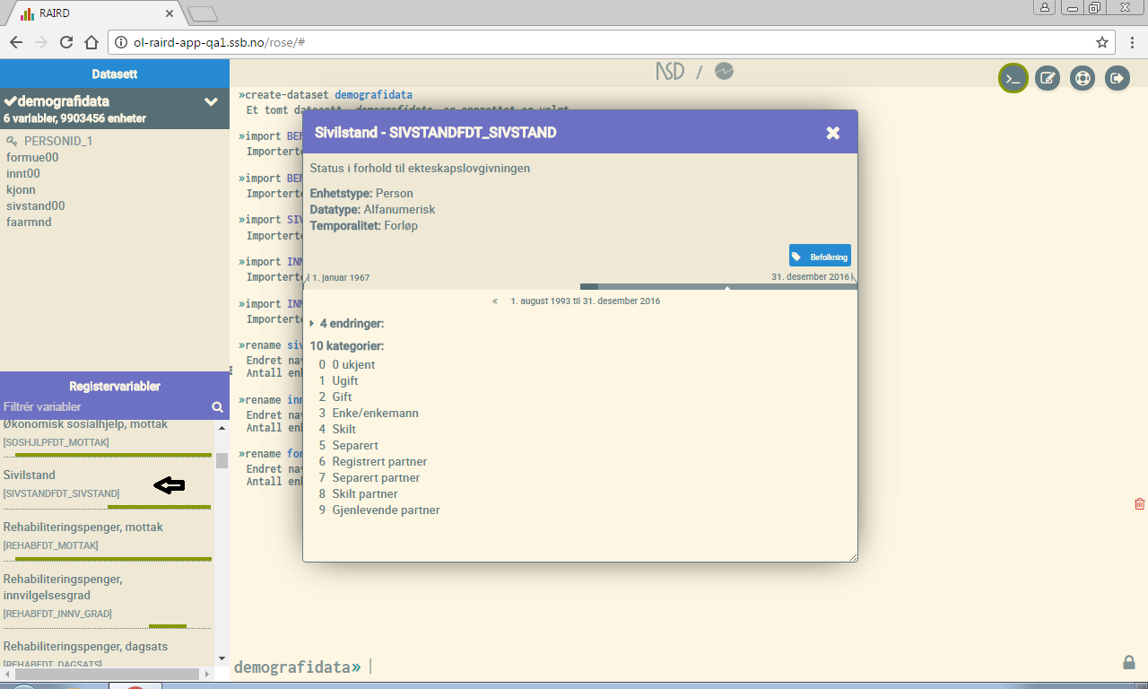 I eksempelet nedenfor blir dette eksemplifisert for variabelen "Sivilstand". Variabelen presenteres da i et eget vindu som en kan flytte på og justere. Det gir detaljert informasjon om variabelen: