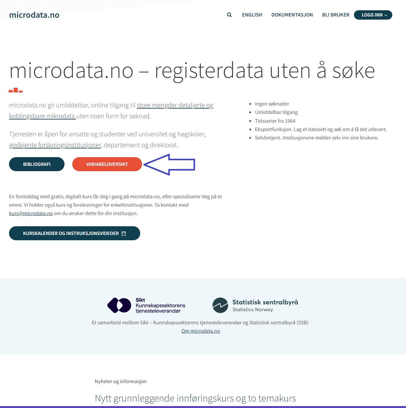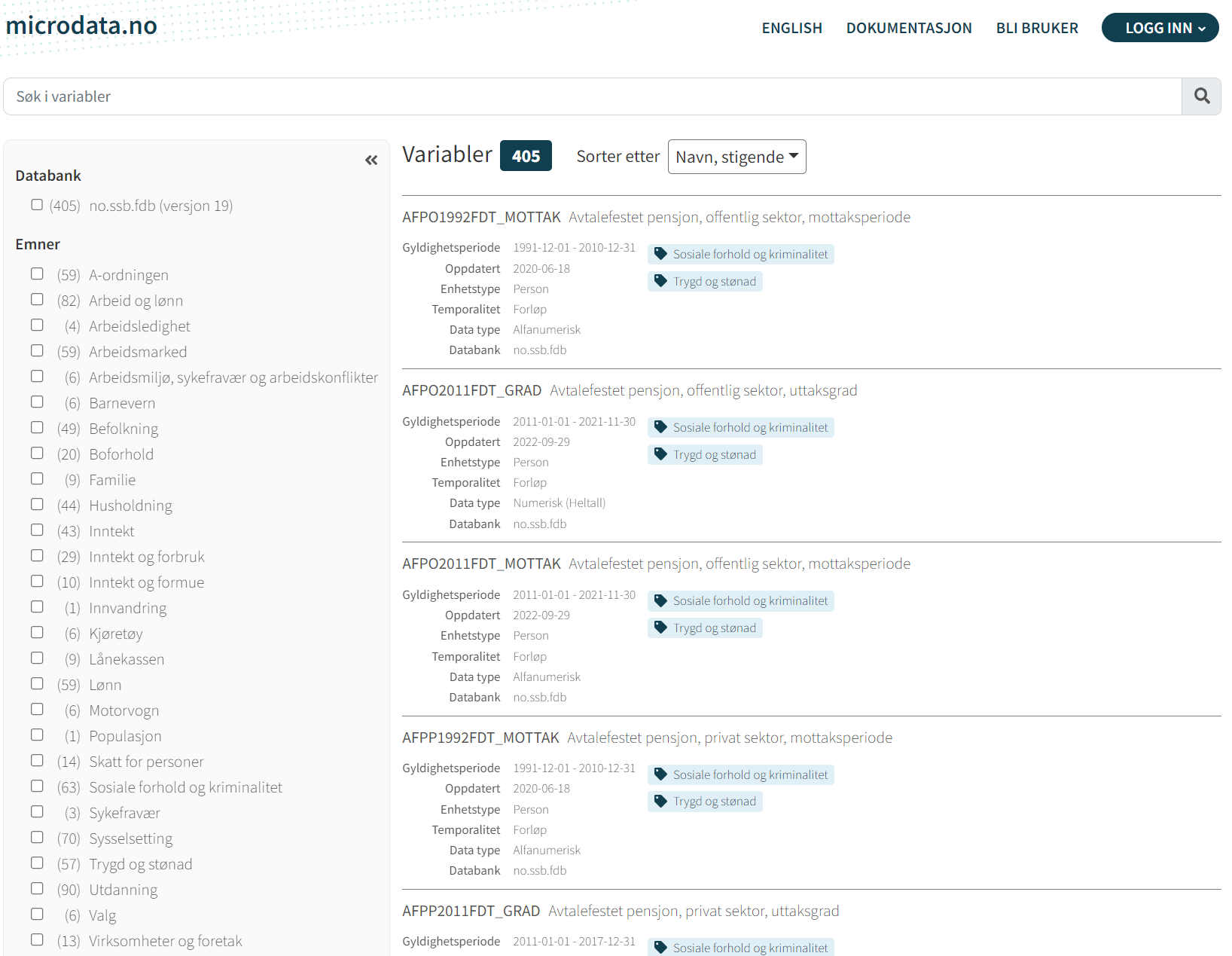 Microdata.no har en lang rekke demografiske, utdanningsrelaterte, økonomiske, sysselsettingsrelaterte og trygderelaterte variabler i databanken. Disse kan en få en oversikt over gjennom å utforske variabeloversikten en finner på åpningssiden (https://microdata.no/discovery):