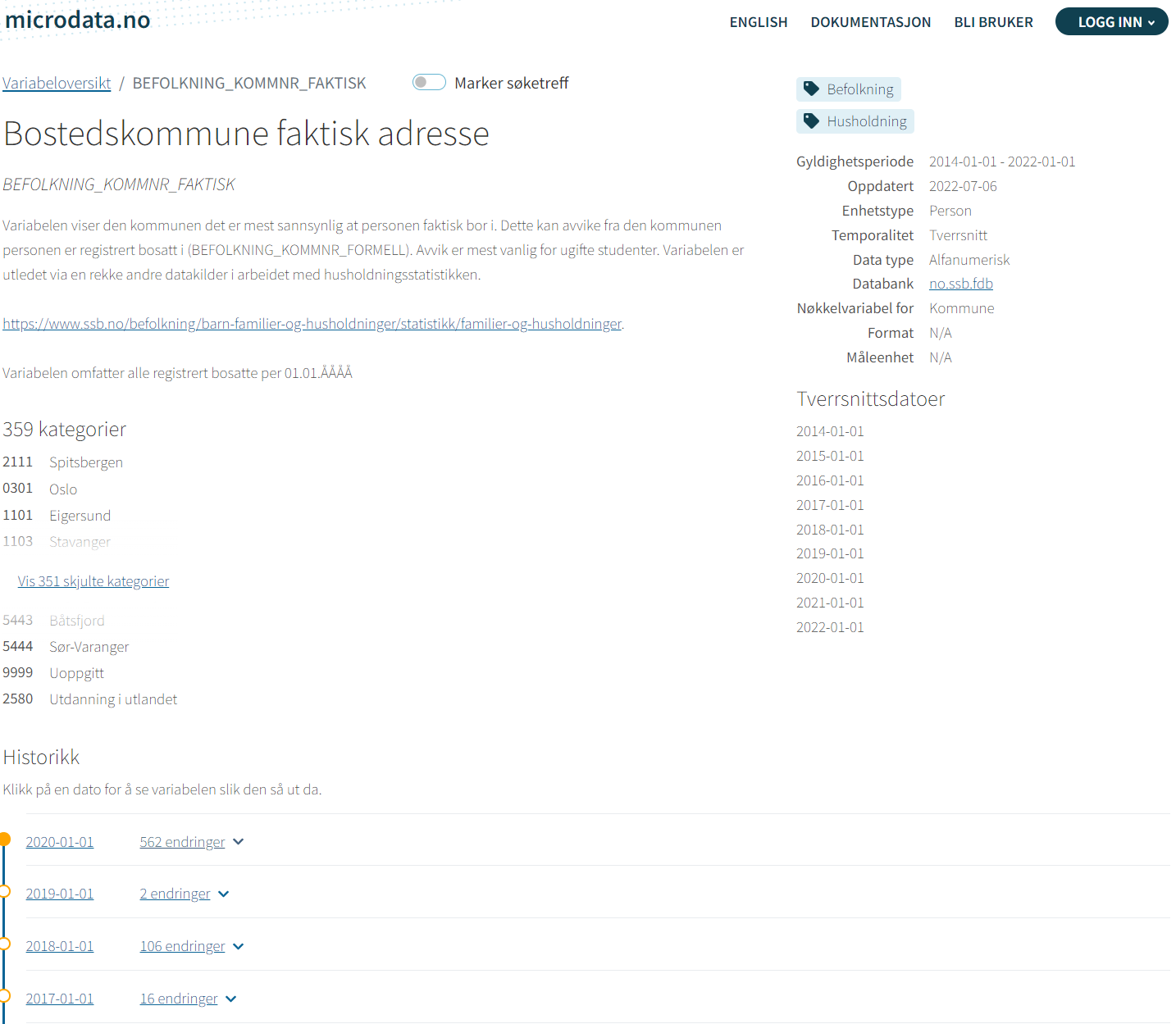 Ved å klikke på en variabel i variabellisten, får en opp definisjoner, kodelister, endringshistorikk og annen nøkkelinformasjon knyttet til den spesifikke variabelen: