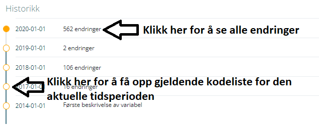 Merk at kodelisten for en gitt variabel endres over tid. Dette må en ta hensyn til dersom en jobber med lengre tidsserier som strekker seg bakover i tid. Det er nemlig gjeldende kodeliste for det aktuelle tidspunktet en må forholde seg til. Spesielt kommunekoder, utdanningskoder og næringskoder har relativt hyppige endringer i kodelistene. Ved å klikke på punktene foran tidspunktene som angir start for en ny kodeversjon, får en opp gjeldende kodeliste for den aktuelle tidsperioden. Om en klikker på angivelsen av antallet endringer, får en opp en oversikt over hvilke endringer som er blitt gjort for samme tidsperiode: