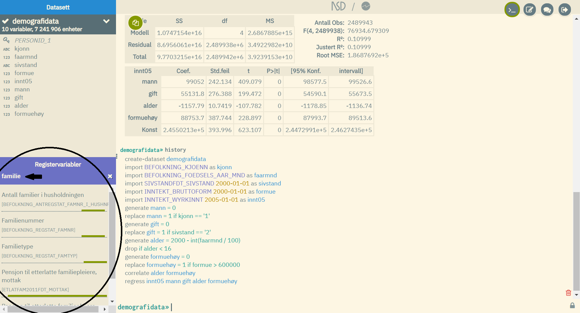 Som illustrasjonen nedenfor viser, finnes det også en fullstendig variabeloversikt nederst til venstre inne i selve kommandovinduet. Også her kan en filtrere variabellisten ved å skrive inn deler av et variabelnavn i søkefeltet. Som for variabelisten en finner på åpningssiden, fungerer søket både mot variabelbeskrivelse og selve navnet. På den måten blir det lettere å finne variabelen en ønsker.