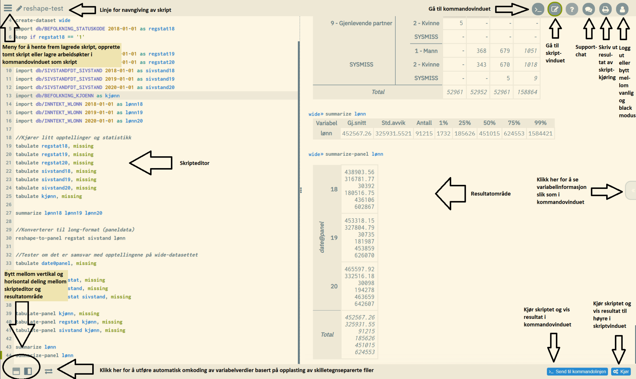 Skripteditoren befinner seg til venstre i skriptvinduet, og lar brukere legge inn sekvenser av kommandoer som kan kjøres samlet som et skript. Resultatet av en skriptkjøring vises i høyre del av skriptvinduet når en bruker "Kjør"-knappen.