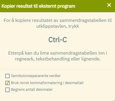 For statistikk/analyseresultat kan man velge å bruke norsk kommategnsetting gjennom å huke for dette valget (anbefales).