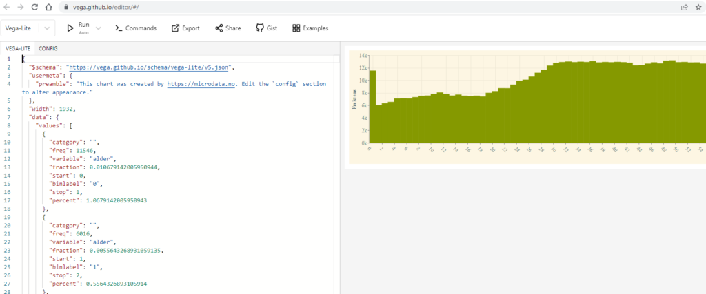 Redigering av figur i Vega-editor. Man redigerer i Vega ved å justere på de ulike verdiene i venstrevinduet, for deretter å klikke på «Run»-knappen øverst. Da tegnes grafen opp på nytt med de nye innstillingene. Til slutt kan grafen lagres ved å klikke på «Export»-knappen.