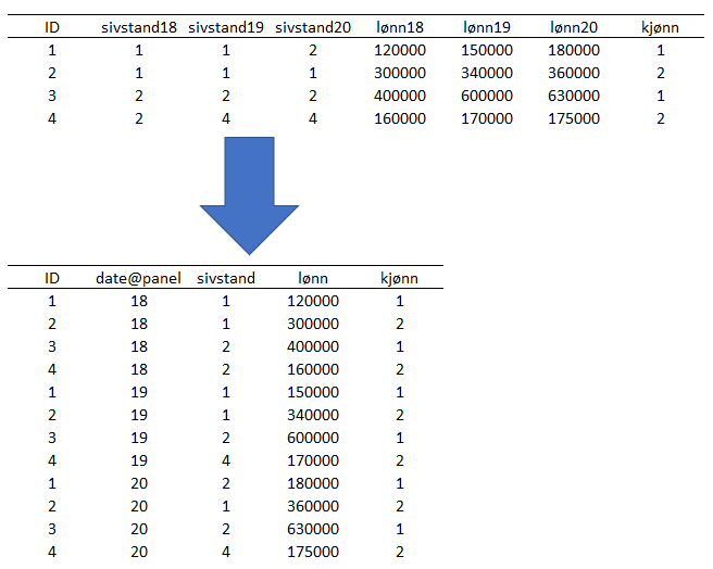 Illustrasjonen nedenfor viser hvordan restruktureringen logisk foregår under panseret. Eksempelet viser et datasett med wide-format som inneholder variablene sivstand18-sivstand20, lønn18-lønn20, og kjønn. Sivilstand (sivstand) og lønn måles altså for årene 2018-2020, mens kjønn er en fast opplysning som bare måles en gang. Datasettet konverteres til long-format ved hjelp av kommandoen reshape-to-panel sivstand lønn. Variabelen date@panel opprettes automatisk og inneholder undernivået som i dette tilfellet er tosifret årstall.