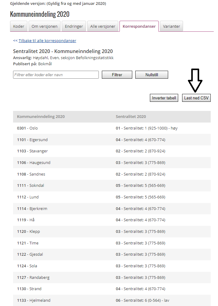 Trinn 5: Du har nå en tabell som koder om fra kommunekoder til sentralitetskode. Denne kan lastes ned ved å klikke på "Last ned CSV". Velg passende lagringsområde på din PC, og hent frem filen når du er i dialogboksen for opplasting av filer i skriptvinduet.