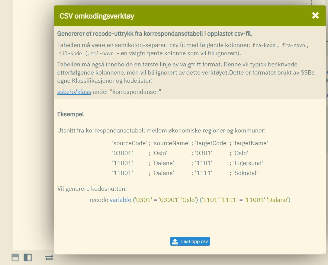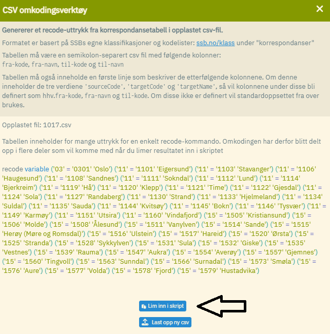 I microdata.no finnes det en løsning for dette. Ved å klikke på pilsymbolet nede til venstre i skriptvinduet, vises det en dialogboks som gir deg mulighet til å laste opp en skilletegnseparert fil som du på forhånd har lastet ned fra f.eks. SSB sin standardklassifikasjonsside: www.ssb.no/klass