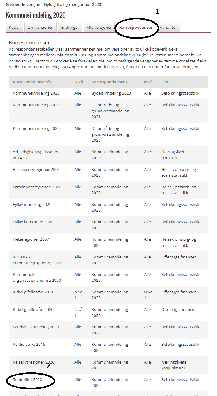 Trinn 3: Velg fanen "Korrespondanser" og deretter den omkodingen du er interessert i, f.eks. "Sentralitet 2020"