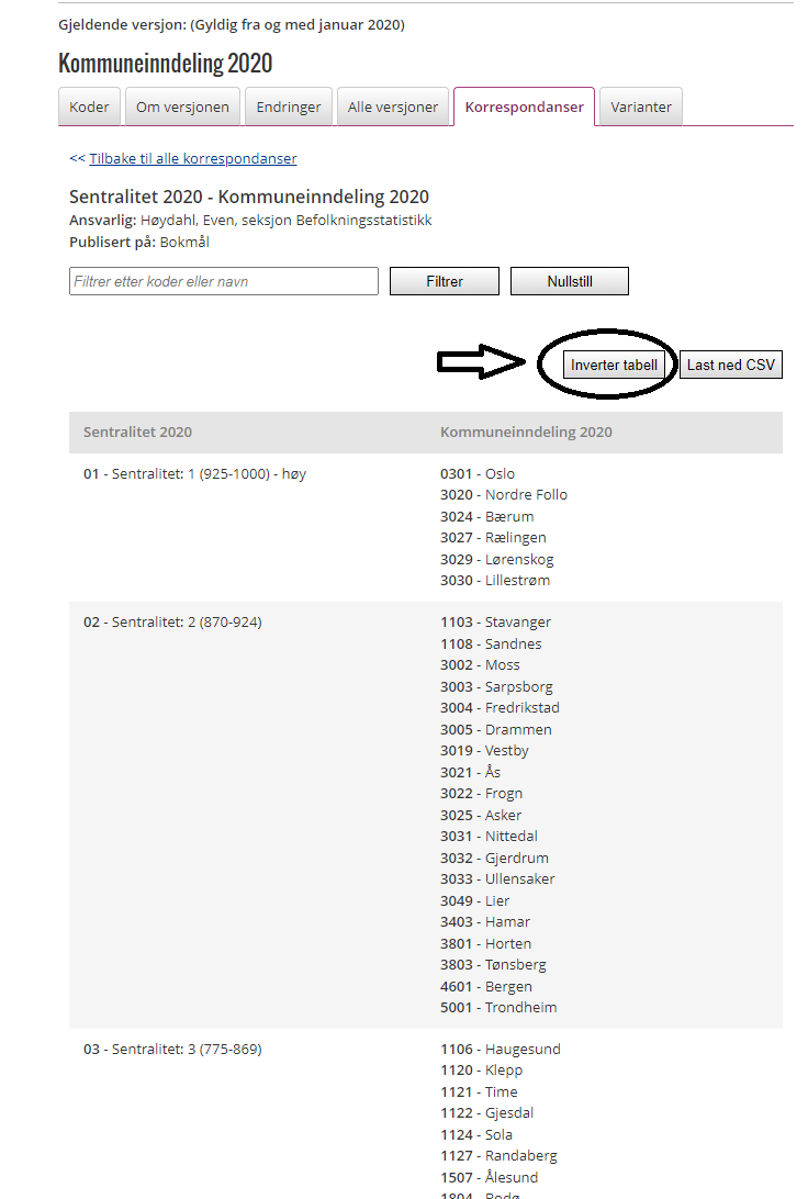 Trinn 4: Denne tabellen koder om fra sentralitetskode til kommunekode. Om du vil kode om motsatt vei, altså fra kommunekode til sentralitetskode, klikker du på "Inverter tabell"
