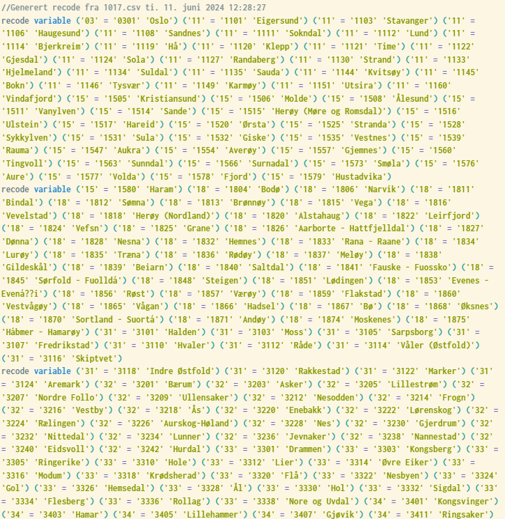 I tilfeller hvor man ønsker å omkode mange variabelverdier, f.eks. kode om alle kommunekoder og erstatte med koder for sentralitet, eller kode om fra en næringsstandard til en annen, vil det være tidkrevende og tungvint å legge inn hver enkelt kode i et recode-uttrykk. Slike uttrykk vil typisk utgjøre mange linjer avhengig av hvor mange koder som skal kodes om.