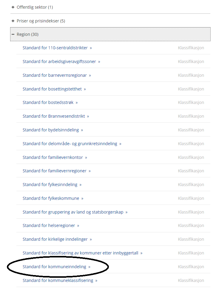 Trinn 2: Velg emnet du ønsker å hente omkodingsfil fra, f.eks. "Standard for kommuneinndeling" som du finner under "Region"