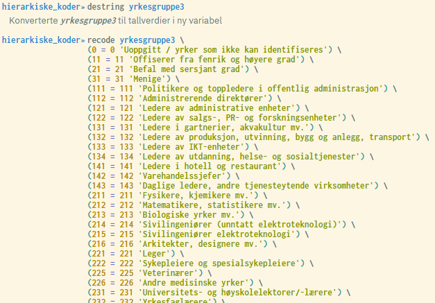 Variabler med hierarkiske kodeverdier har innebyggede labler i datasettet. Men dersom du ønsker å trekke ut deler av verdiene for å lage en grovere inndeling, må du selv opprette nye labler som passer til den grovere inndelingen. Slike labler finner du på SSB sin hjemmeside: https://www.ssb.no/klass/. Du søker etter den aktuelle kodestandarden i en tematisk inndeling, og finner da standarder som kan lastes ned som tekstfil. Det er også mulig å lage en semikolonnsepartert fil som kan lastes opp i microdata.no, og som automatisk legger på labler. Man lager fire kolonner der man legger inn følgende verdier: