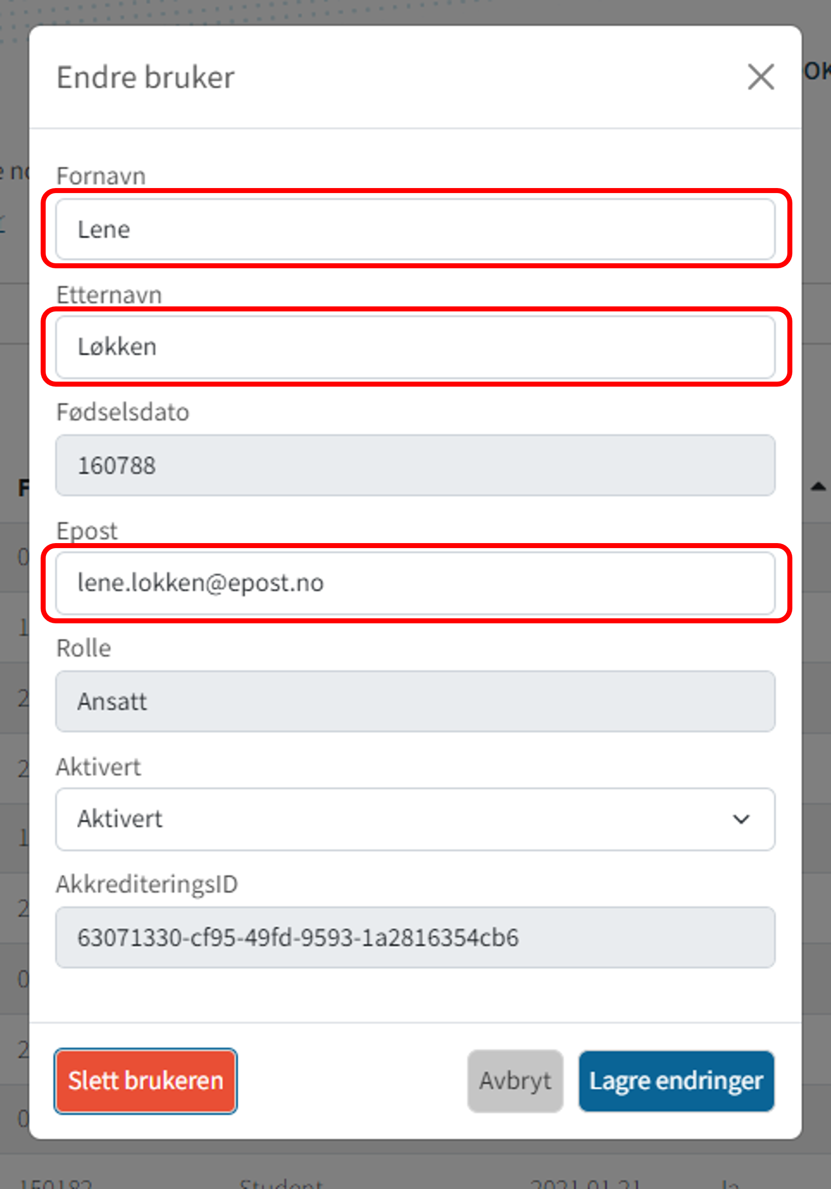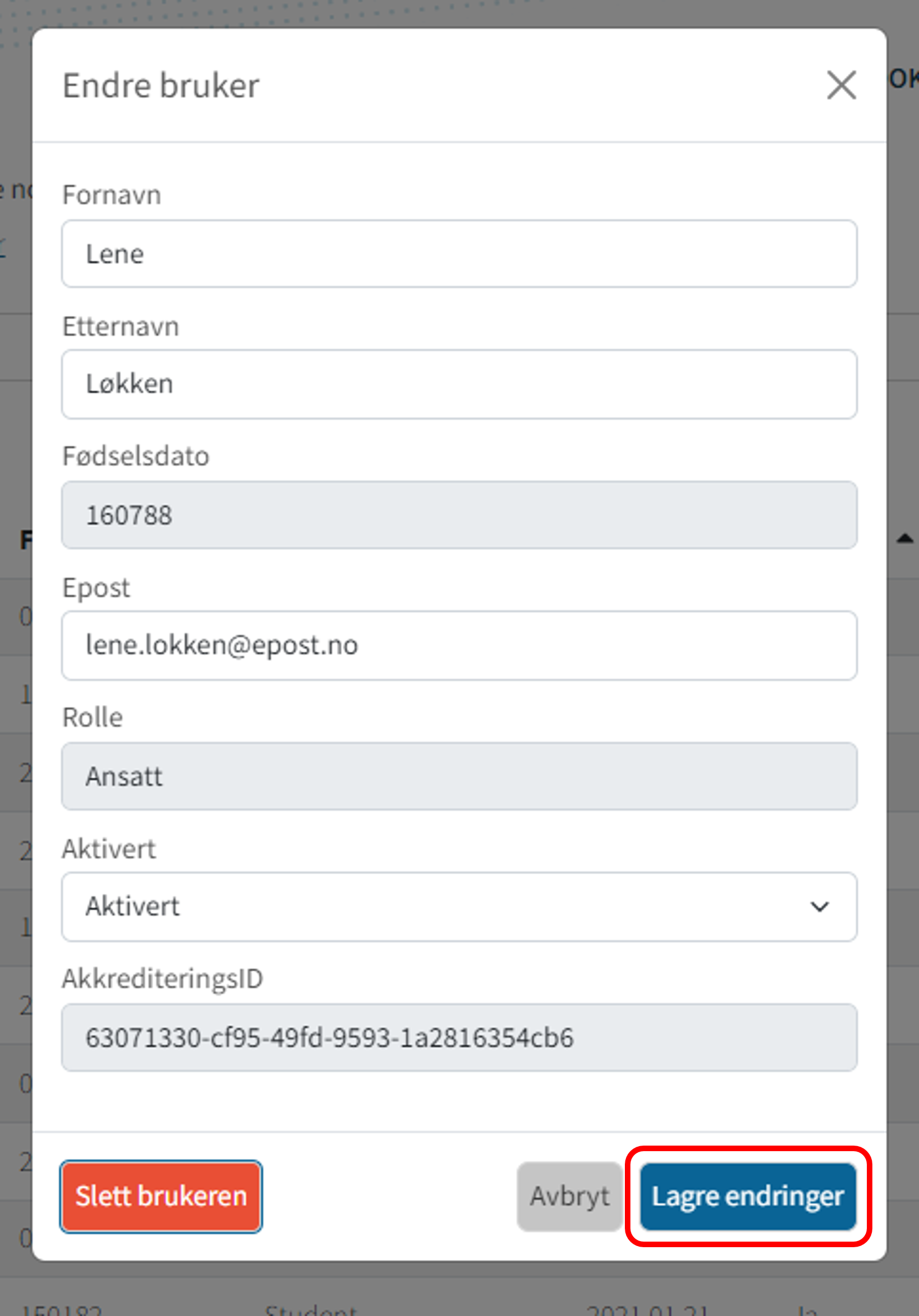 Hovedkontakt eller Brukeradministrator kan endre informasjon om institusjonens brukere etter behov.