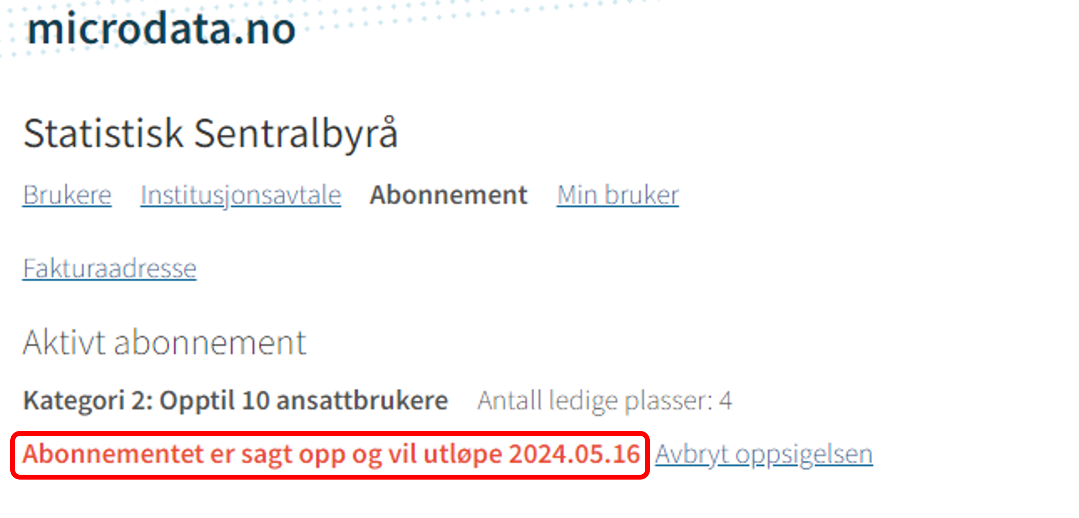 For å kunne si opp abonnementet, må Hovedkontakt velge fanen Abonnement for å komme til abonnementssiden.