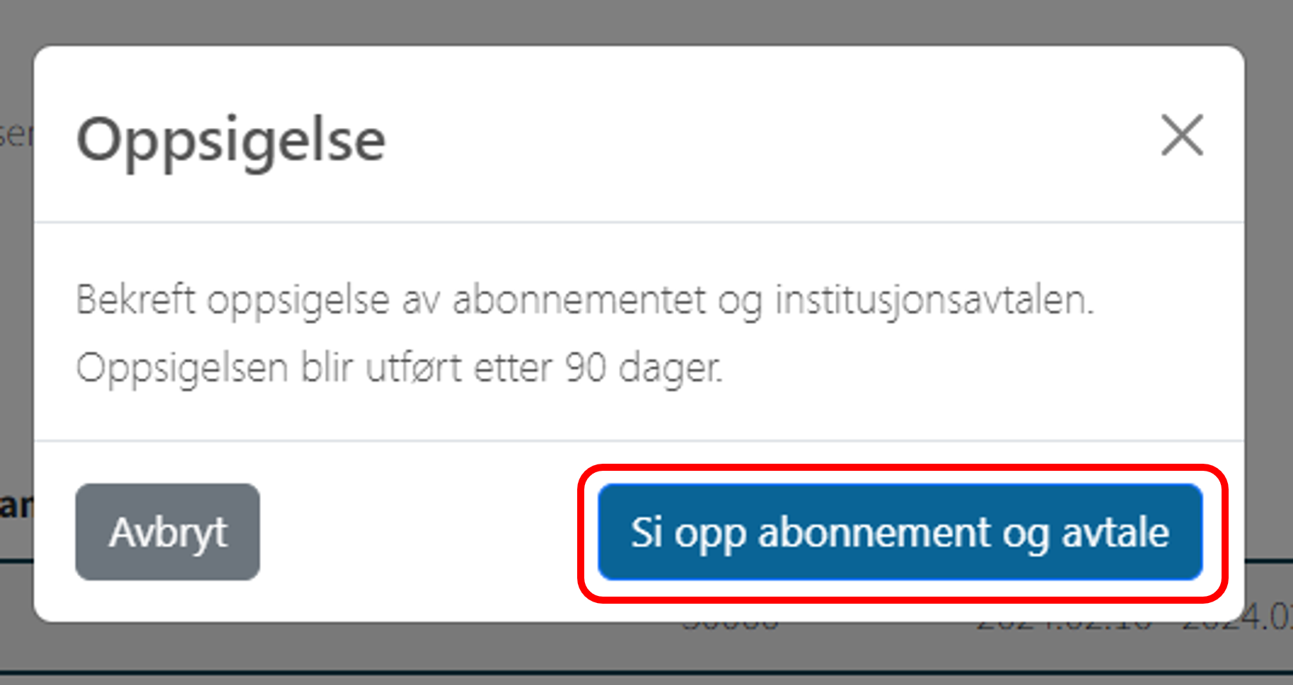 For å gjennomføre oppsigelsen, må Hovedkontakt velge Si opp abonnement og avtale.