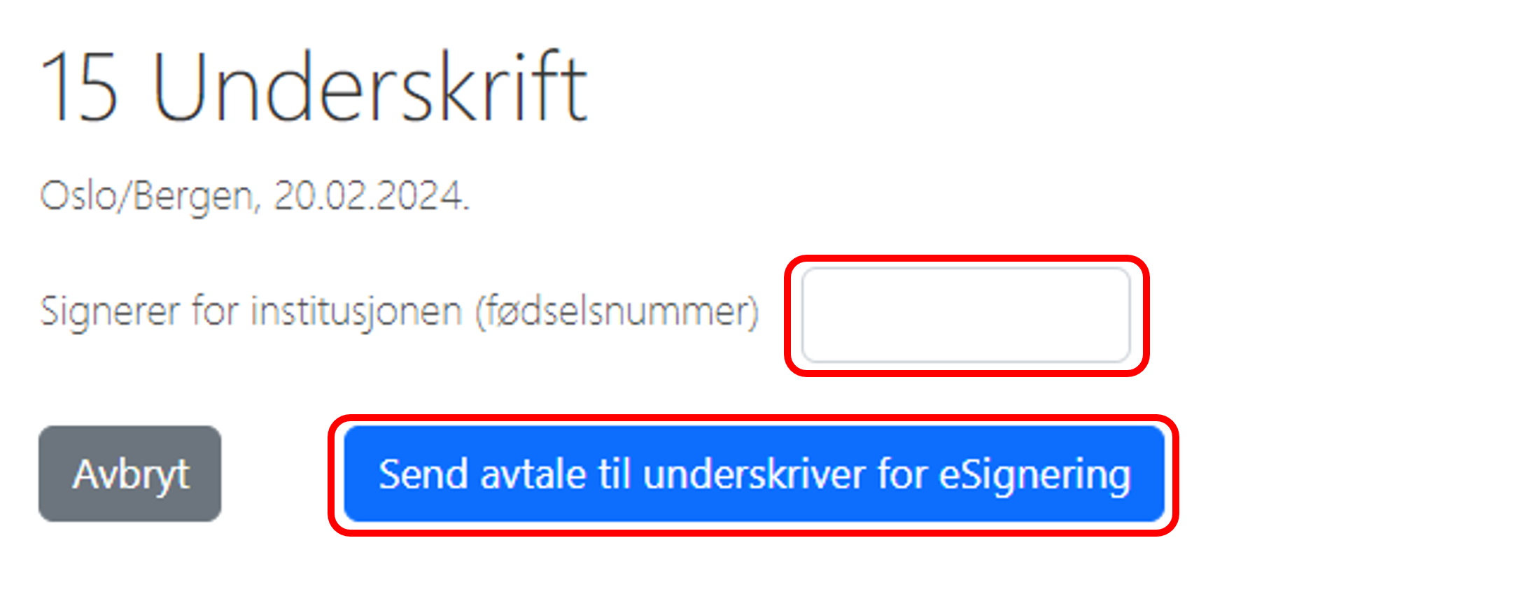Les nøye igjennom avtalens punkter. I punkt 15 legges inn fødselsnummeret til vedkommende som skal signere avtalen på institusjonens vegne.