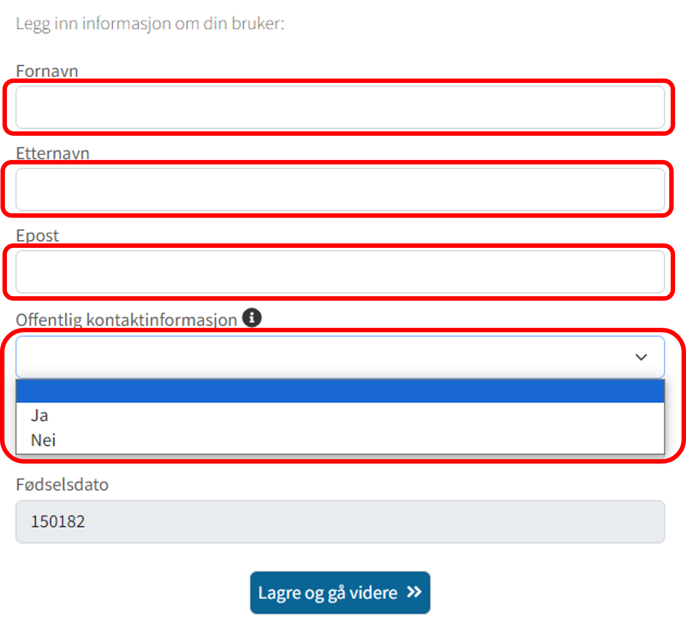 Før man kan gå videre må manglende informasjon fylles ut. Alle feltene er obligatoriske.